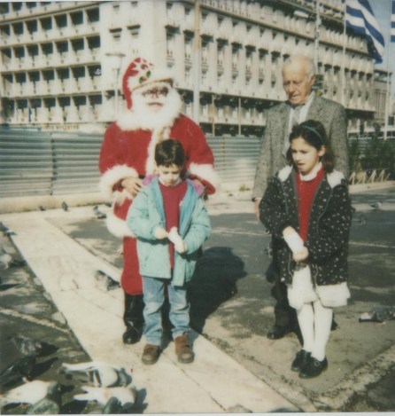 Du coup, depuis petite, quitter Bruxelles pour passer NoĂ«l en GrĂšce Ă©tait toujours une joyeuse occasion, en plus de celle de revoir la famille, de sentir remonter le thermomĂštre de quelques degrĂ©s. Je me souviens d’une fĂȘte passĂ©e en t-shirt quelque part sur le boulevard Mesogeion avec les potes du lycĂ©e, je me souviens de l’Ă©poque oĂč je portais des ballerines et je n’en revenais pas de les porter en dĂ©cembre en pleine journĂ©e. Je me souviens aussi de cette photo, prise sur la place de Syntagma Ă AthĂšnes, oĂč lĂ aussi il faisait si peu froid pour une fin d’annĂ©e que le costume de pĂšre NoĂ«l du monsieur semblait presque hors-sujet. Mais je me souviens surtout, en souriant, de combien mon grand-pĂšre a rĂąlĂ© quand il a entendu le prix qu’il devait payer pour obtenir la photo. C’Ă©tait l’Ă©poque de la GrĂšce opulente, celle des annĂ©es 90, oĂč on dĂ©pensait les drachmes sans compter. C’Ă©tait aussi l’Ă©poque oĂč prendre une photo et voir immĂ©diatement le rĂ©sultat tenait de la rĂ©volution, et PolaroĂŻd rĂ©gnait en maĂźtre sur cette possibilitĂ©. Mais pappou, qui avait connu les deux guerres en entier, n’Ă©tait pas du genre Ă se faire arnaquer. Il a engueulĂ© le type et l’a traitĂ© d’escroc, j’Ă©tais gĂȘnĂ©e de voir deux adultes se disputer, mais j’imagine qu’il a fini par payer vu que le rĂ©sultat est ici. Et aujourd’hui alors qu’il pleut dehors et qu’il est parti, je pense Ă lui, son sourire bienveillant, sa voix grave et son costume gris. Joyeux machintruc, fĂȘtez ça comme vous voulez, et vivement l’Ă©tĂ© đ