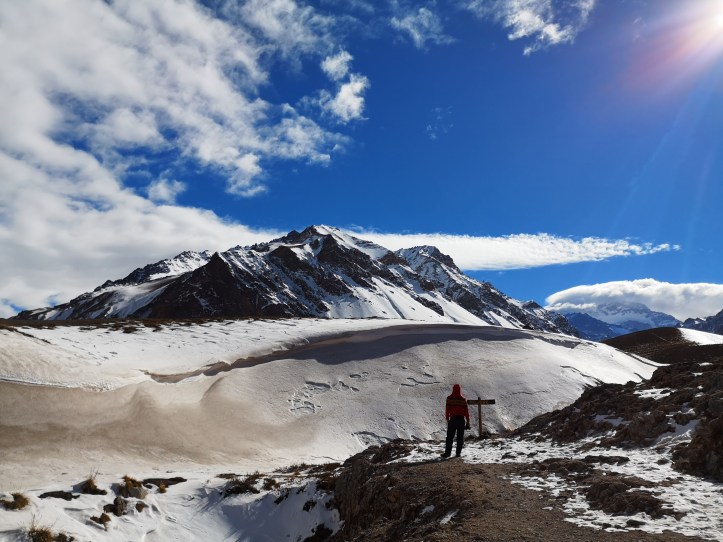 On dirait pas comme ça, parce qu’on Ă©tait dĂ©jĂ Ă trois mille mĂštres d’altitude, mais la petite colline dressĂ©e lĂ , c’est le plus haut sommet de toute l’AmĂ©rique. Eh ouais, mĂȘme les Yankees et leur Denali en Alaska n’arrivent pas aux 6900 mĂštres de l’Aconcagua. Reconnaissable hiver comme Ă©tĂ© grĂące Ă sa pointe blanche Ă©ternelle, ancien lieu de passage des Quechuas, on s’est arrĂȘtĂ©s sur la route pour le saluer. MĂ©ga respect aux courageux qui chaque annĂ©e entreprennent le voyage pour le monter.